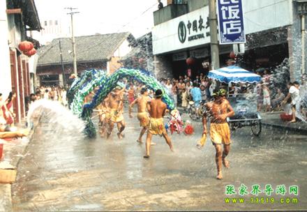 張家界潑水龍又叫“澆水龍”,于唐朝時(shí)期由移居本地的白族興起演變而成,在永定區(qū)的尹家溪鎮(zhèn)西尹村、莫家崗村十分盛行,是當(dāng)?shù)?a class="insidelink" href="http://m.xacaiyin.com/fengqing/1130174734.html" target="_blank" title="土家族">土家族,白族、苗族在天熱干旱時(shí)節(jié)求雨祈福的一種形式。一旦出現(xiàn)旱災(zāi),當(dāng)?shù)仡^面人物就會(huì)出來(lái)組織潑水龍,演出極其隆重。