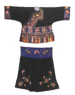 ,外套青色滿肩馬褂,腰系桃花兜,并配撤穗荷包,下著青色寬腳褲,腳穿白布襪子和天官云頭鞋。婦女頭上蒙白色繡花帕,兩耳垂環(huán),手戴鐲子或戒指,外套繡花圍裙,用繡花飄帶系著,右上胸佩掛三吊或五吊銀質(zhì)牙簽。下著蘭色寬褲,腳纏白色裹腳布,穿繡花尖尖鞋。無婚女性則挽“簪巴”,挽于腦后的稱“粑粑”,挽于頭頂?shù)姆Q高把簪,簪上套有網(wǎng),橫插簪子;兒童衣服多繡花,外圍肚兜,頭戴虎頭鼓針菩薩帽,頸戴“項(xiàng)圈”、“百家鎖”等,手腕套有銀圈,上系小吊,吊上有錘、鈴、鞋、斧、簽等。