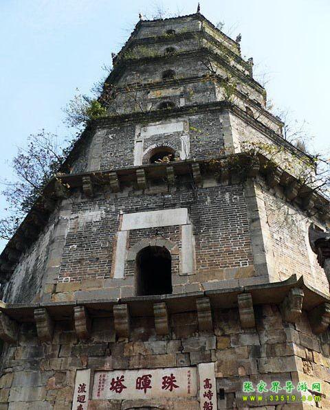 塔高10丈5尺,磚石結構,七層八棱,石階旋梯。正門西南向,上方漢白玉橫額鐫刻著斗大楷書“珠暉塔”三字,兩邊漢白玉雕刻楷書對聯(lián):“高峙船山遠綿學脈,流回耒水廣助文瀾”。塔基四周刻有飛禽走獸圖形,塔內(nèi)拱門嵌有石刻碑文,為江蘇學政王先謙撰寫、寧夏知府黃自文手書,原為6塊,現(xiàn)存4塊。塔前建有廊廡,僧房數(shù)楹。塔尖銅頂,映日生輝。