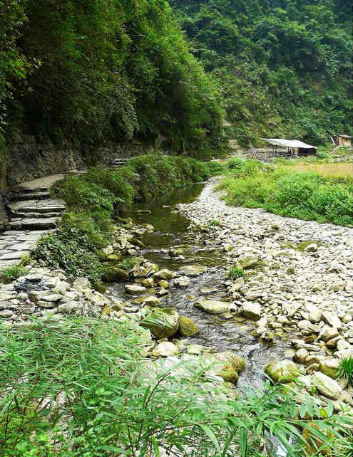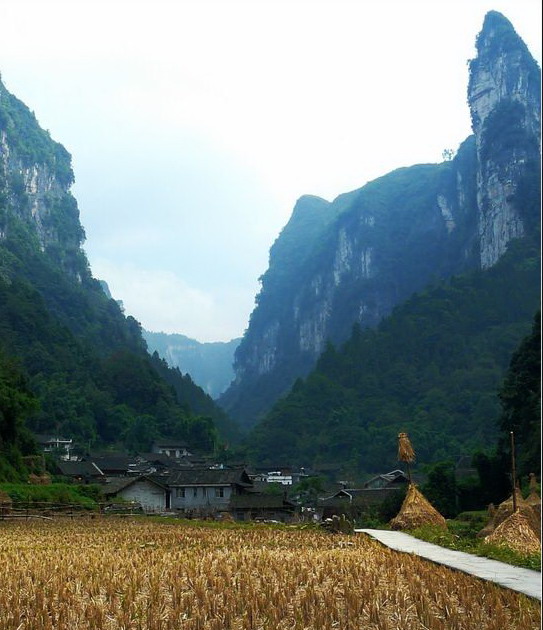 村寨四周山勢雄奇,絕壁夾天;“夯峽”、“九龍”、“玉泉”三溪在這里相會,如同三根彩帶在這里相交結(jié)。這里是風(fēng)景區(qū)的中心,一萬五千多米長的青石板路從這里一直通向各個景點這里還是一個角度十分好的觀景臺,人立于此,只要原地轉(zhuǎn)動身子,就可觀賞到東西南北全方位的各個景點,那含情脈脈的“相依巖”、昂首奮蹄的“駟馬峰”、惟妙惟肖的“孔雀開屏”五彩繽紛的“彩云壁”和“畫屏峰”……盡在眼中無不景象萬千,令人目不瑕接。詩人石元機贊曰: