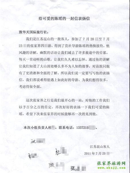 游客杜小姐一行為表揚(yáng)導(dǎo)游陳瑤寫來表揚(yáng)信致我張家界華天國(guó)旅