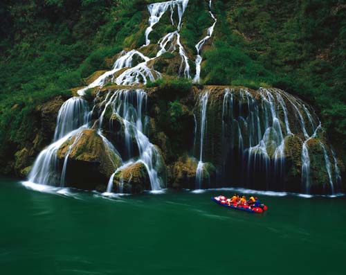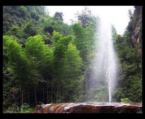 在金鞭溪游覽過程中,可見一組奇峰,有兩座較高的石峰緊密相連,下半截連為一體,上半截一高一矮,高者略欠身,低者稍后仰,好一幅相愛擁抱的絕妙畫面,恰似一對久別重逢的夫妻,故名相會峰,亦稱千里相會。相傳東海龍宮小龍女常來此地觀賞風(fēng)景,一次偶然的機會,結(jié)識了峨眉山遠道而來的后生,二人情投意合,很快便產(chǎn)生了愛情。龍王知道此事以后,非常惱怒,決意拆散二人,多次將小龍女關(guān)在龍宮,但小龍女想方設(shè)法逃出來,常常與情人相會。龍王一氣之下,將二人點化成石,便成石峰“千里相會”。 十一、茅巖河漂流