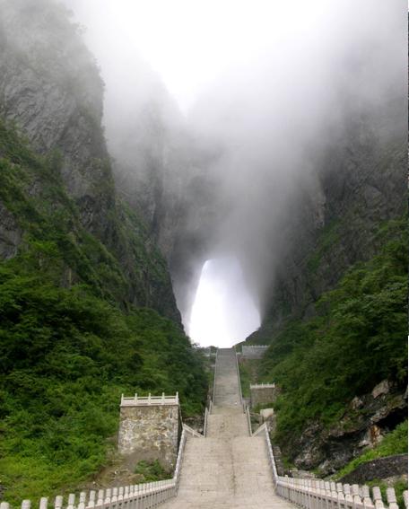 天門山上有一個(gè)天門洞,2006年03月,曾有俄羅斯之戰(zhàn)斗機(jī)在此表演飛躍天門洞的表演,還造成滿大的轟動。上天門洞之前,必須先征服999個(gè)階梯,經(jīng)過一番努力終于登上天門洞之后,突有豁然的感覺,人在山上,卻仍然在洞中,從這里更可以鳥瞰整個(gè)張家界市的景色。用完晚餐后,即乘車從張家界回車長沙。